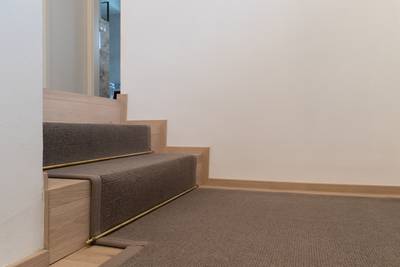 Investorka v tomto případě hledala řešení, jak dřevěné schody udělat bezpečnější pro chůzi a zároveň neubrat prostoru na celkovém harmonickém vyznění. Přírodní vlněný koberec Creatuft Iona v barvě taupe (světle hnědá) tuto úlohu splnil dokonale.